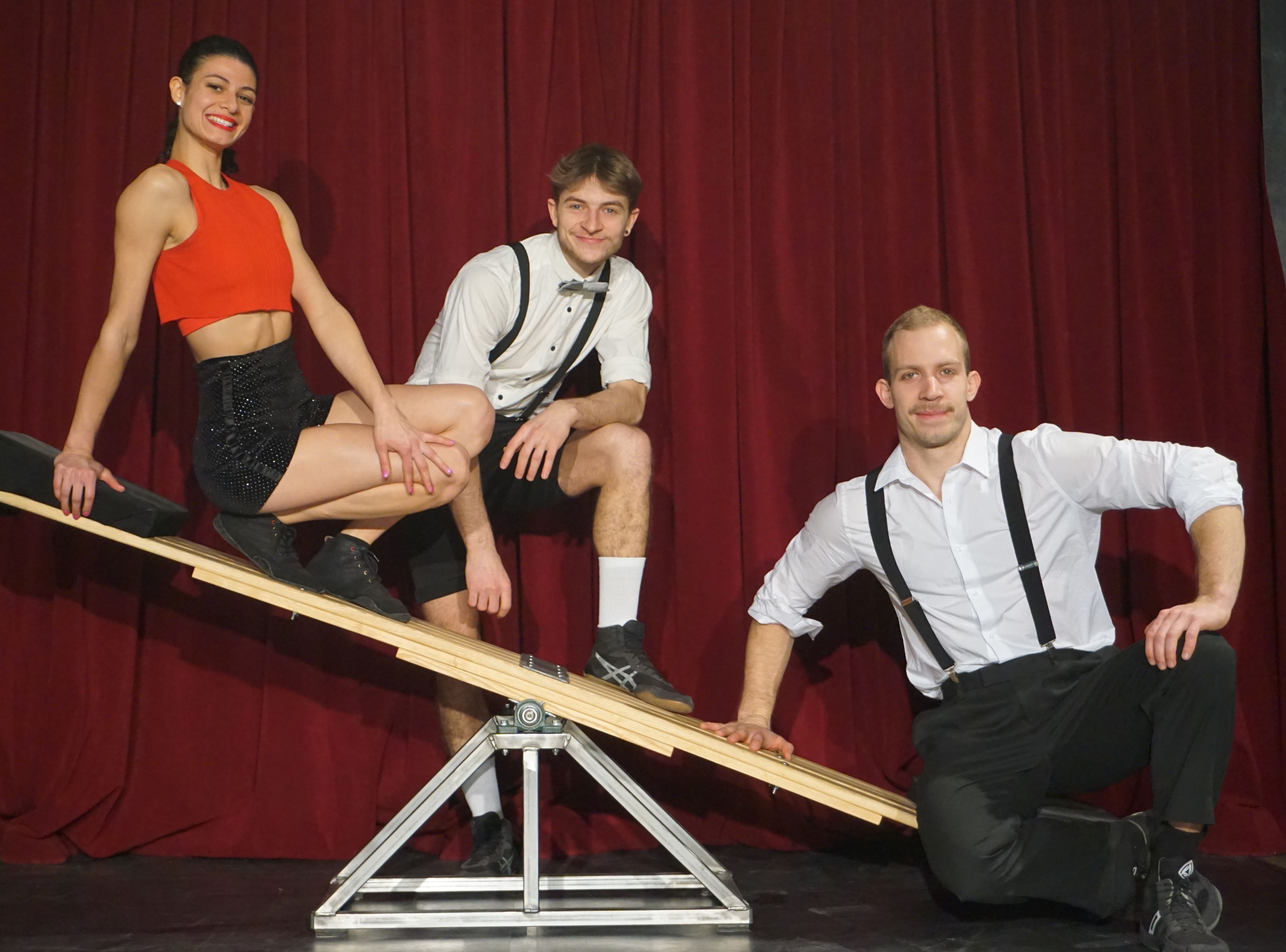Nous aimons mettre en valeur nos différences qui rendent ce trio original: Nina voltige , Janosch porte et Benjamin se retrouve entre les deux, il porte et voltige à la fois. Sur scène, nous présentons notre savoir-faire acrobatique avec une bonne dose d’humour et une pincée de rythme. Nous mélangeons tout cela sous une tension électrisante qui nous donne finalement notre nom: